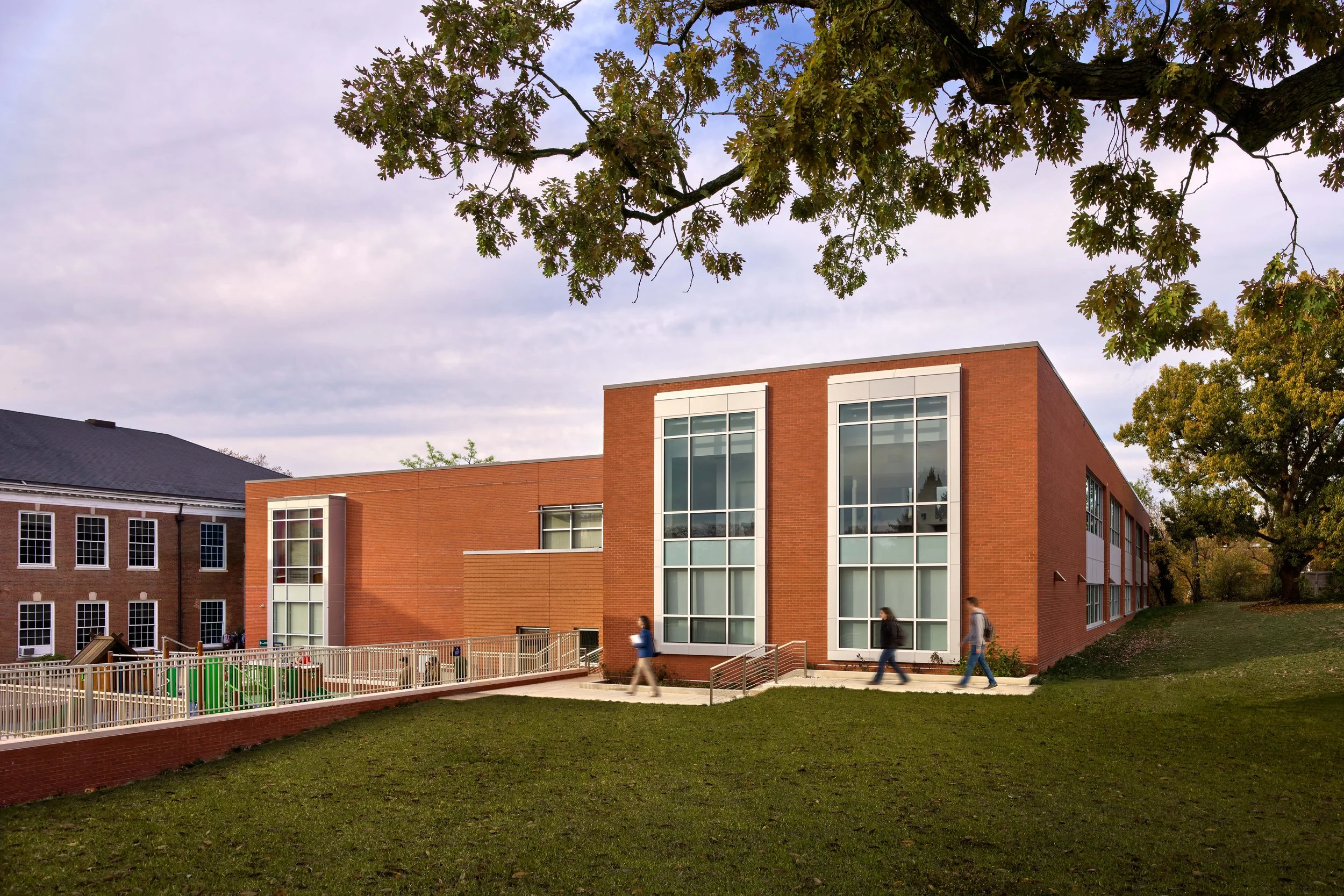 This project created a new wing on the east side of the school with 10 classrooms, restrooms, outdoor spaces including a new playground, and stormwater management facilities. This addition reflects the architectural language of the existing wing and is a clear connection to the existing school. A new cafeteria addition is being added to the west side of the existing school.